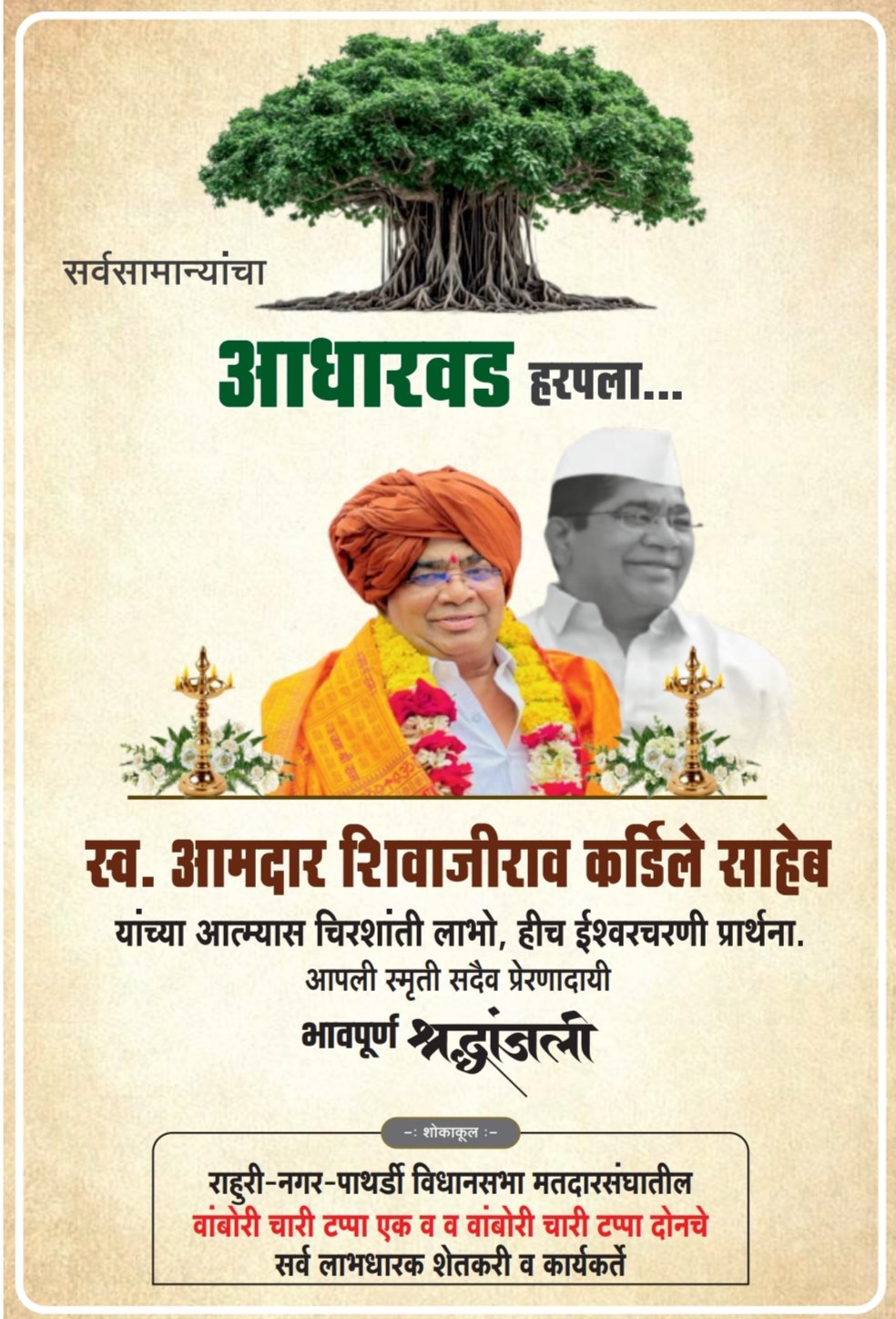 राहुरी–नगर–पाथर्डी विधानसभा मतदारसंघाचे विद्यमान आमदार शिवाजीराव भानुदास कर्डिले यांचे नुकतेच हृदयविकाराच्या तीव्र झटक्याने निधन झाले. त्यांच्या निधनाने पाथर्डी, राहुरी आणि नगर सह संपूर्ण जिल्ह्यात शोककळा पसरली असून त्यांच्या कर्तृत्वाची परंपरा आजही प्रत्येक गावाच्या विकासकामांमध्ये जिवंत आहे.